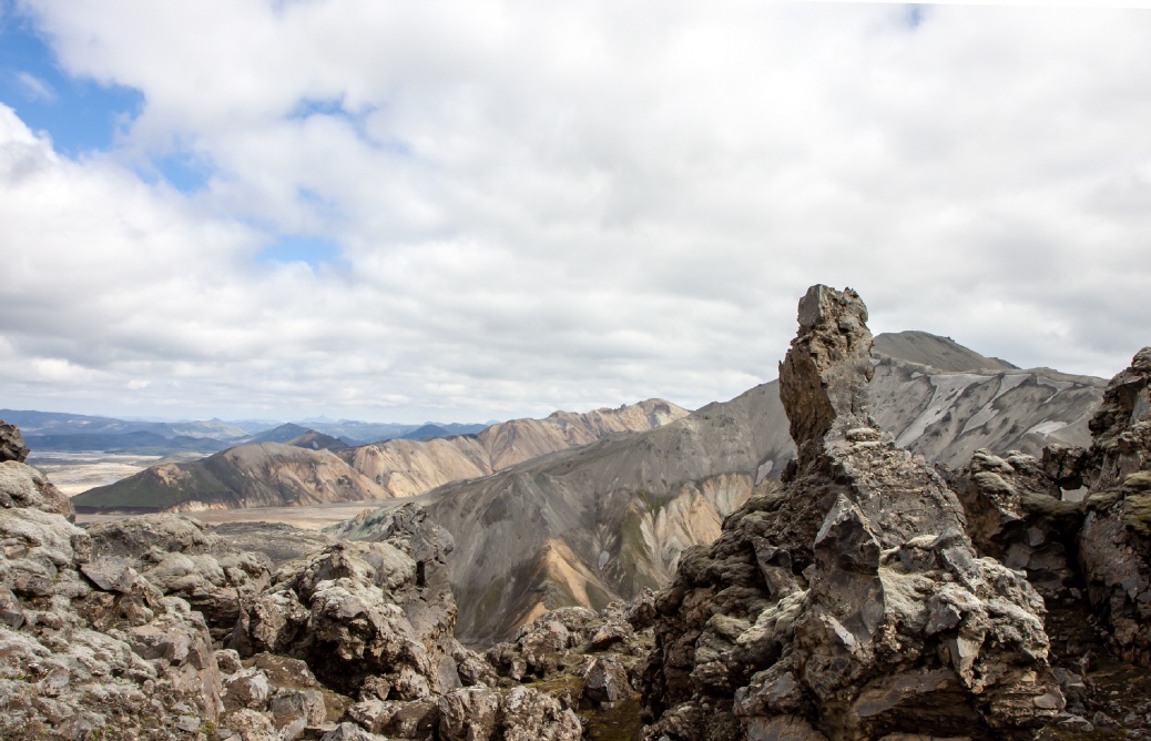 Er blickt hinunter auf die Rhyolithberge von Landmannalaugar.