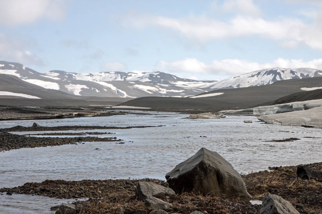 Etwa 2 km vor den Hütten, gilt es einen Seitenarm der Fjórðungakvísl zu furten.