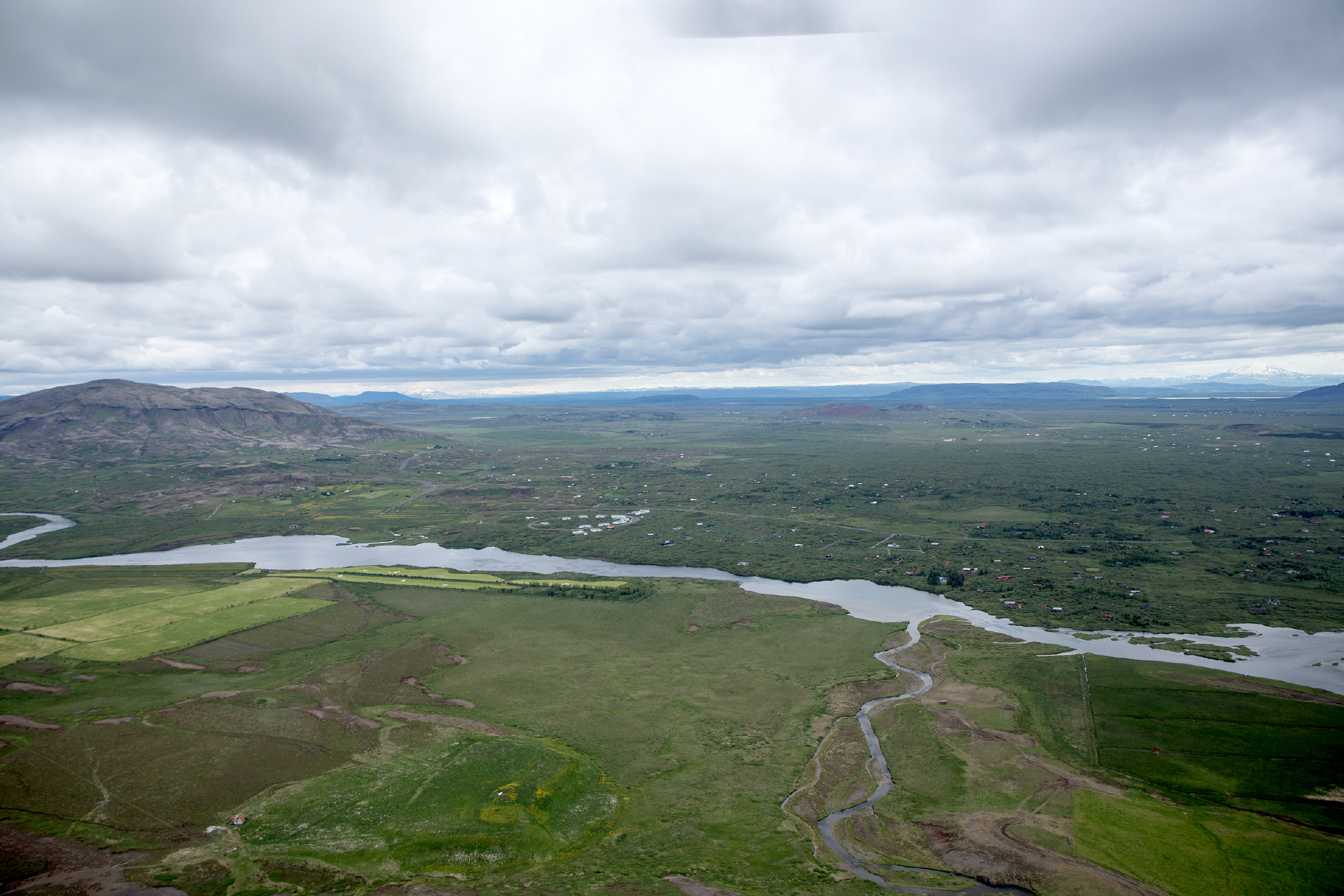 Wir überfliegen den Vörðufell. Im Hintergrund der kleine Ort Laugarás.