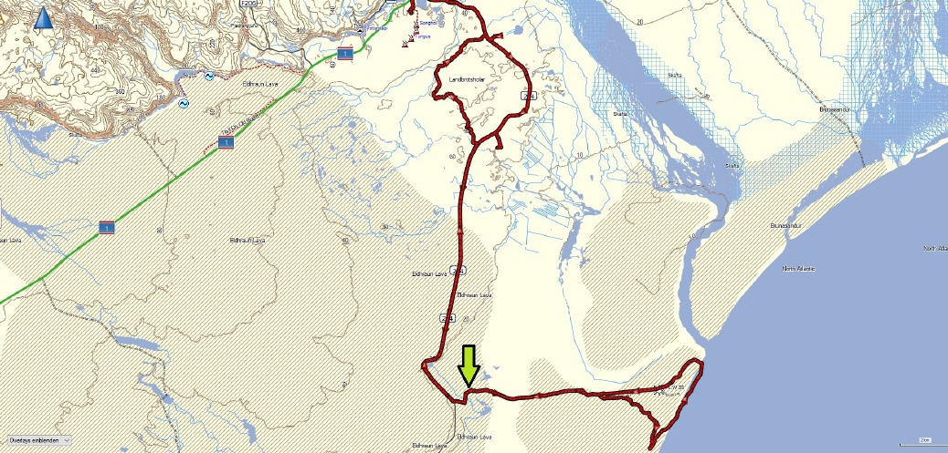Es geht eine ziemlich lange Strecke zurück durch nassen Lavasand, bis wir erneut das Grasgebiet durchfahren und nach kurzer Strecke auf der Straße erneut abbiegen.