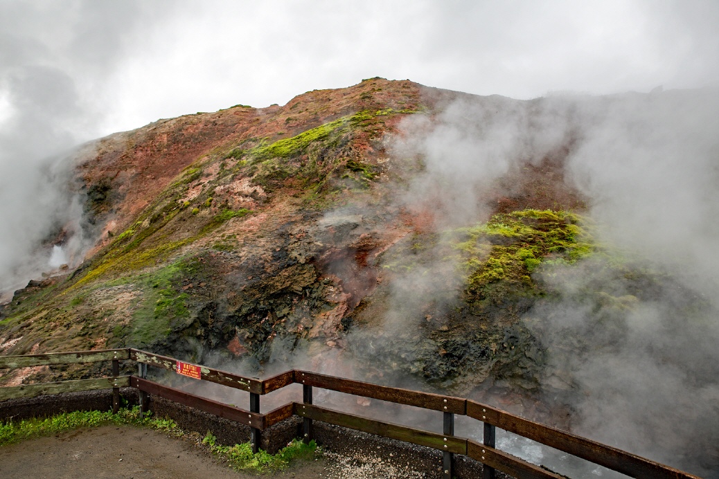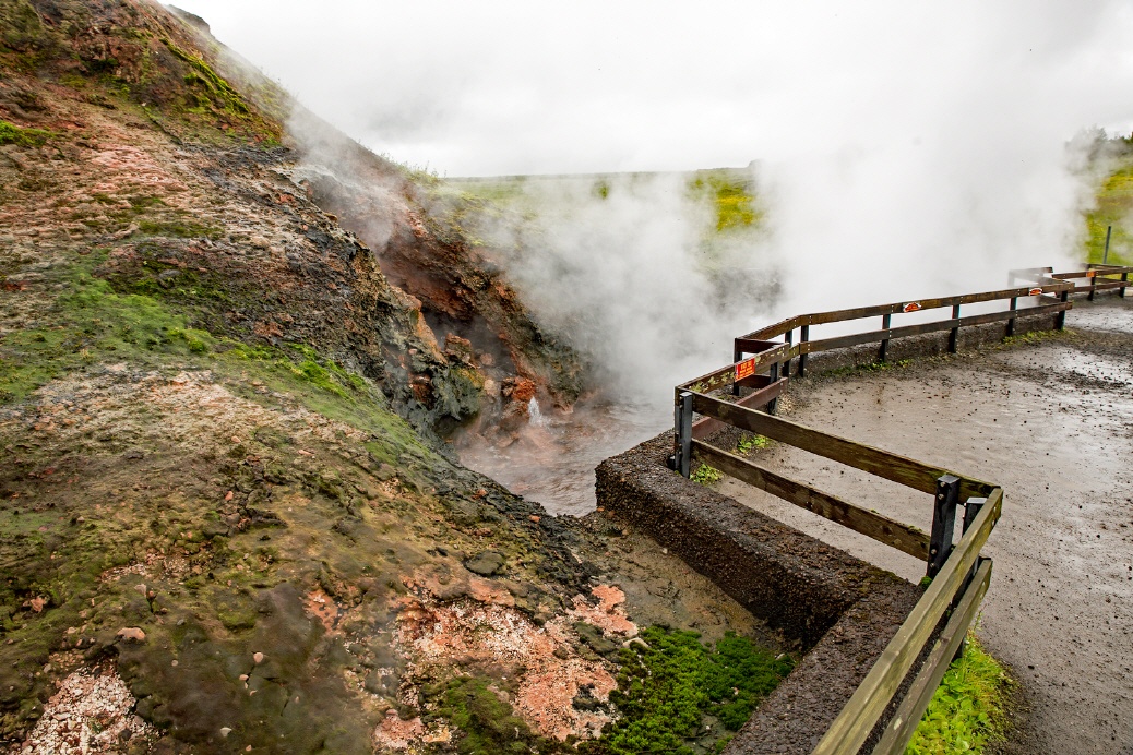 Wir steigen aus, gehen an einem Gebäude der Energieversorgung vorbei und stehen vor mehreren heißen Quellen.