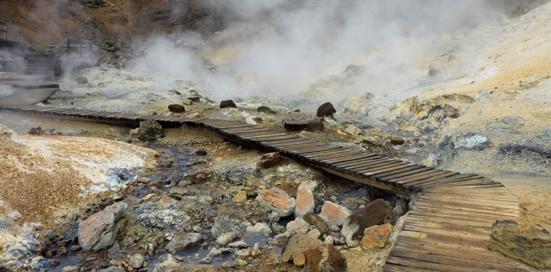 Gut zu sehen, wie der Weg quer durch das Solfatorengebiet gelegt ist.