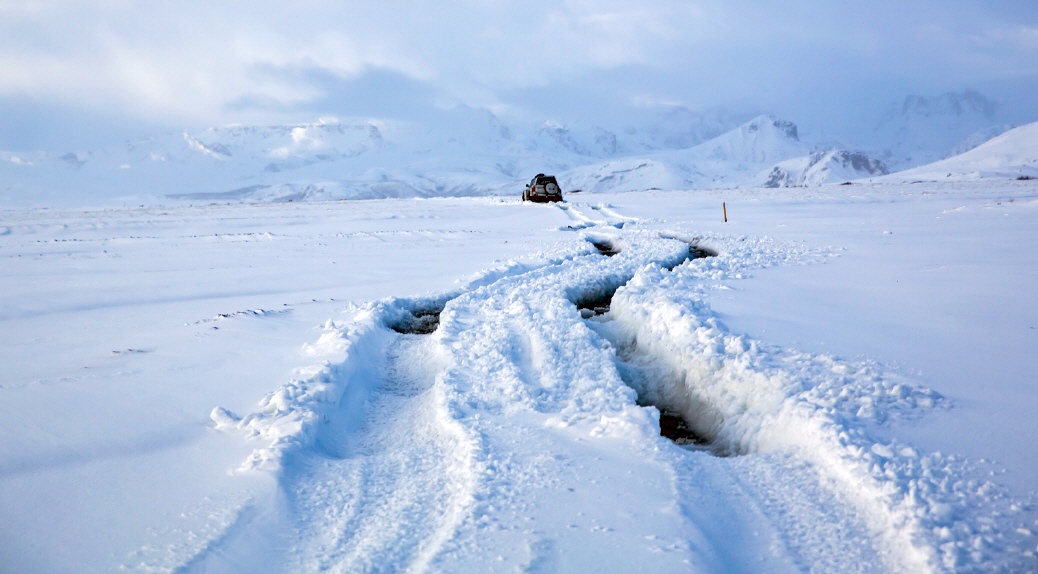 Es ist ein klarer Wintertag. Wir fahren auf dem asphaltiertem Stück der 249.