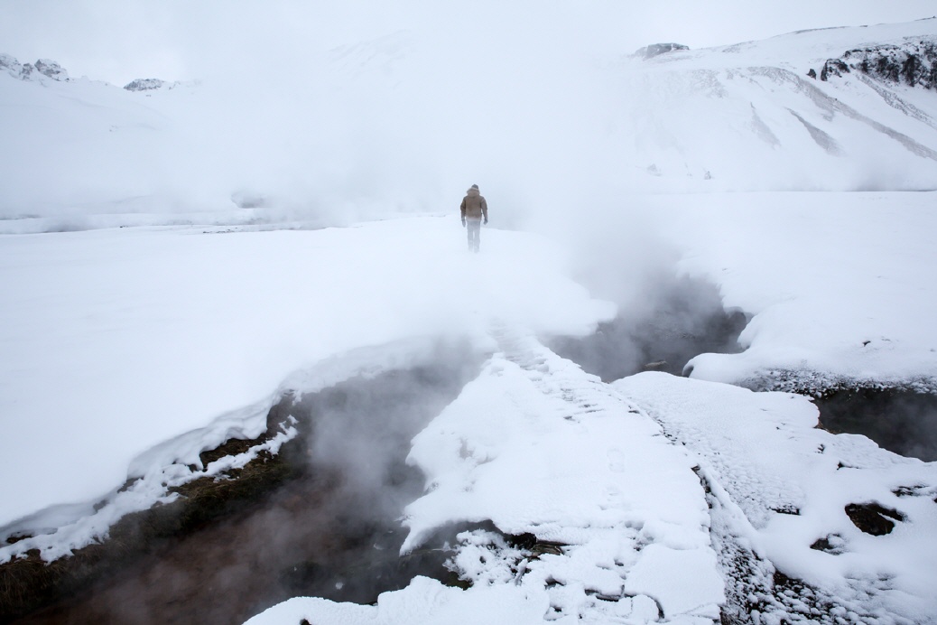 Davor eine große Dampfwolke, die von den heißen Quellen stammt.